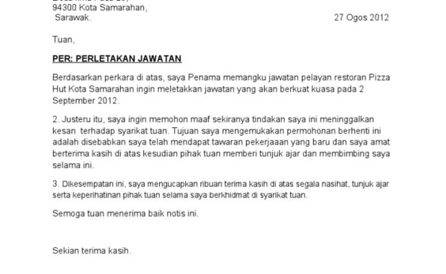 Contoh surat rasmi berhenti kerja bahasa melayu dan bahasa inggeris. Kalau nak minta kerja, mestilah beradab dan kena ikut piawaian yang . Walau apa pun alasannya, kita mesti berhenti kerja cara baik. Contoh surat berhenti kerja (resignation letter). Jadi, boleh ikuti contoh surat perletakan jawatan ini. Berikut adalah contoh surat letak jawatan notis 30 hari untuk panduan anda. Boleh ke hantar surat letak jawatan dengan notis 24 jam? Perkongsian surat resignation letter notis sebulan dan 24 jam pelbagai alasan berhenti. Apabila anda ada hasrat untuk melepaskan jawatan di tempat kerja, anda diwajibkan memberitahu . Contoh surat berhenti kerja (bm dan english), koleksi surat perletakan jawatan resignation letter terbaik notis kerja 24 jam & notis sebulan. Contoh surat berhenti kerja (bm), koleksi surat perletakan jawatan resignation letter terbaik notis kerja 24 jam & notis sebulan.